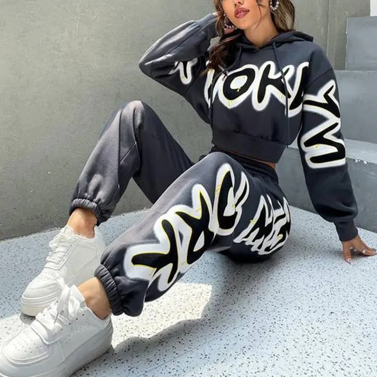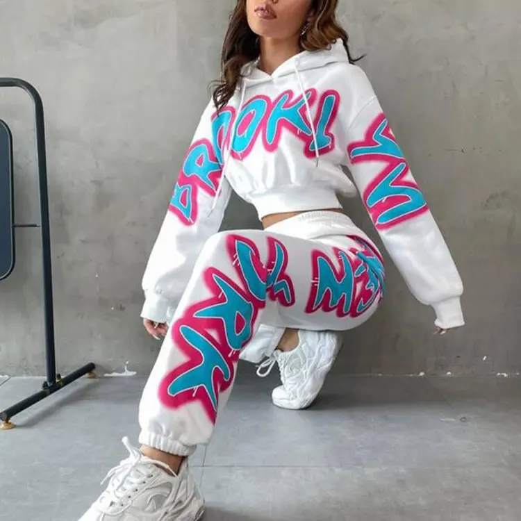 Custom Graffiti Print Cotton Heavyweight Tracksuits 2 Piece French Terry Hand Paint Pullover Crop Hoodie and Joggers Set Women
